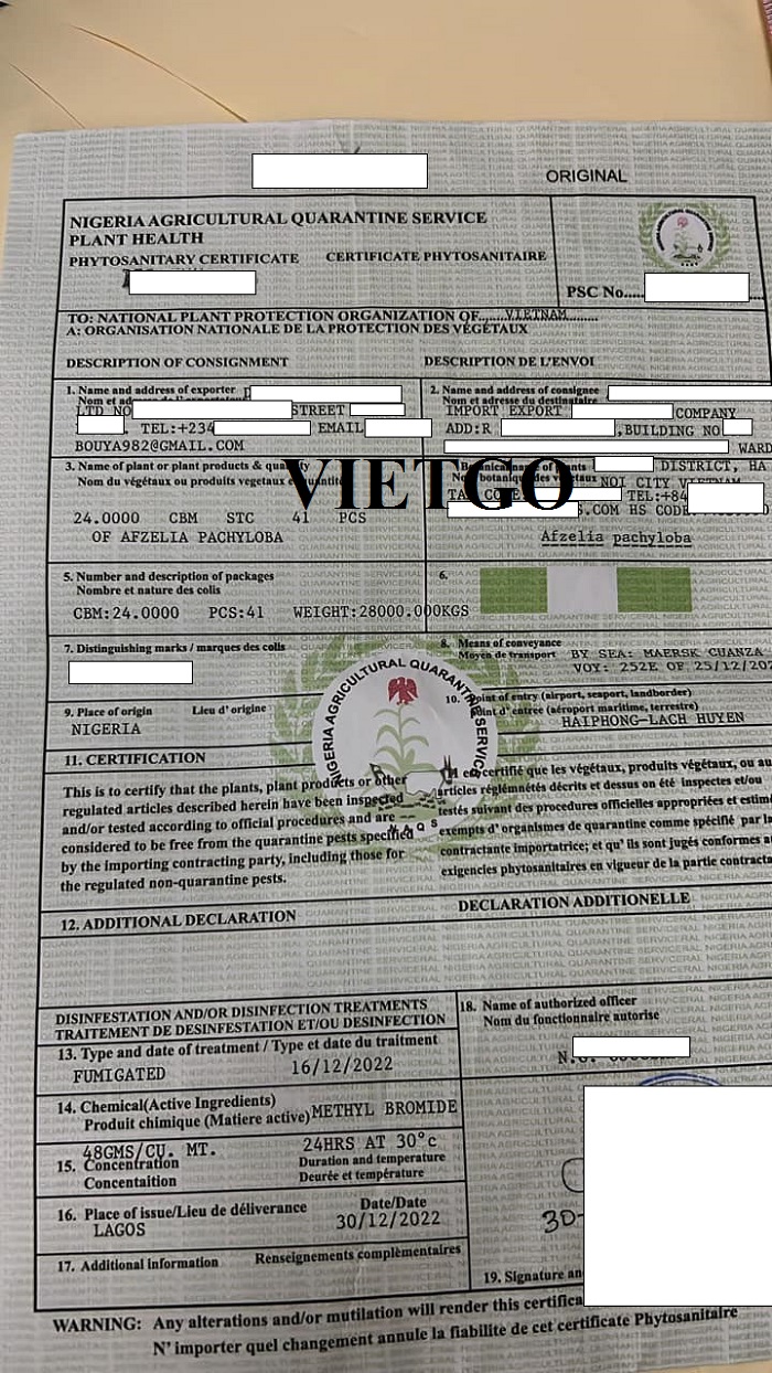 Hình ảnh giấy Chứng nhận kiểm dịch thực vật của sản phẩm mà công ty vị khách hàng nhập khẩu
