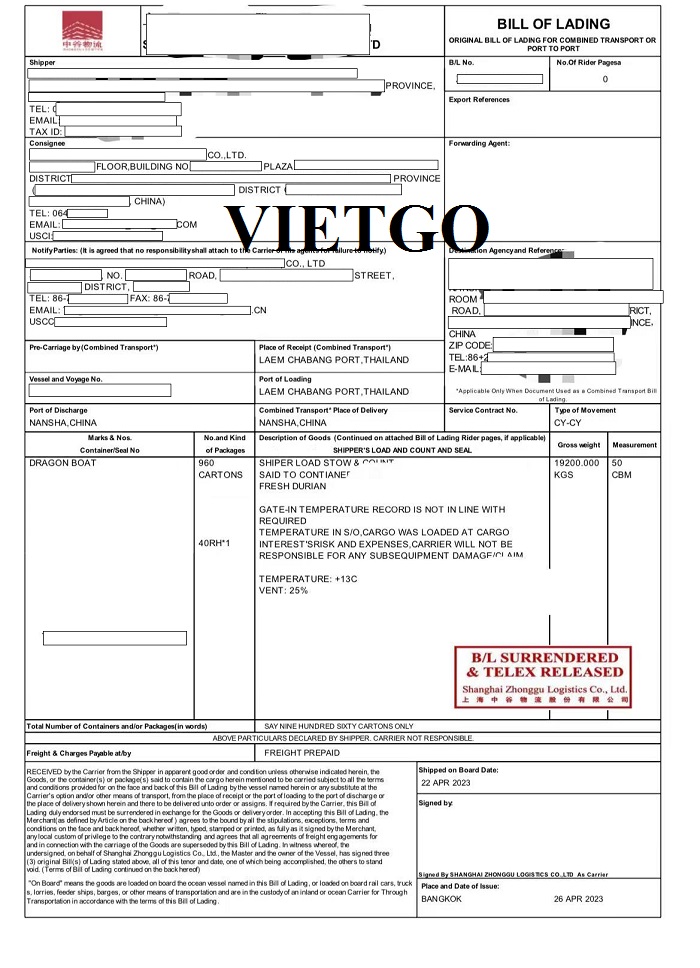 Dưới đây là hình ảnh bản vận đơn của đơn hàng nhập khẩu sầu riêng tươi từ Thái Lan vào ngày 26/04/2023 mà công ty vị khách hàng đã thực hiện thành công: