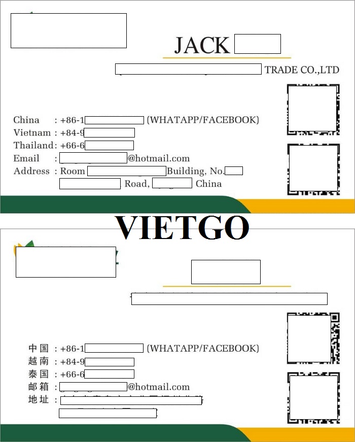 Ông Jack – vị khách hàng của VIETGO lần này hiện đang làm việc cho công ty ██████████ Trade Co., LTD có trụ sở chính tại Trung Quốc. Sau khi thành lập và đi vào hoạt động, ██████████ Trade Co., LTD đã nhập khẩu các sản phẩm nông sản, trái cây tươi từ nhiều quốc gia khác nhau để đáp ứng nhu cầu tiêu dùng ngày càng cao của khách hàng ở thị trường nội địa. Công ty của vị khách hàng luôn tuân thủ triết lý kinh doanh "phát triển theo định hướng thị trường, định hướng công nghệ, lấy hiệu quả và chất lượng làm trung tâm” và luôn đặt khách hàng lên hàng đầu để phục vụ. Bên cạnh mục tiêu kinh doanh, công ty vị khách hàng luôn tuân thủ và theo đuổi các mục tiêu về bảo vệ môi trường, sức khỏe và sinh thái.