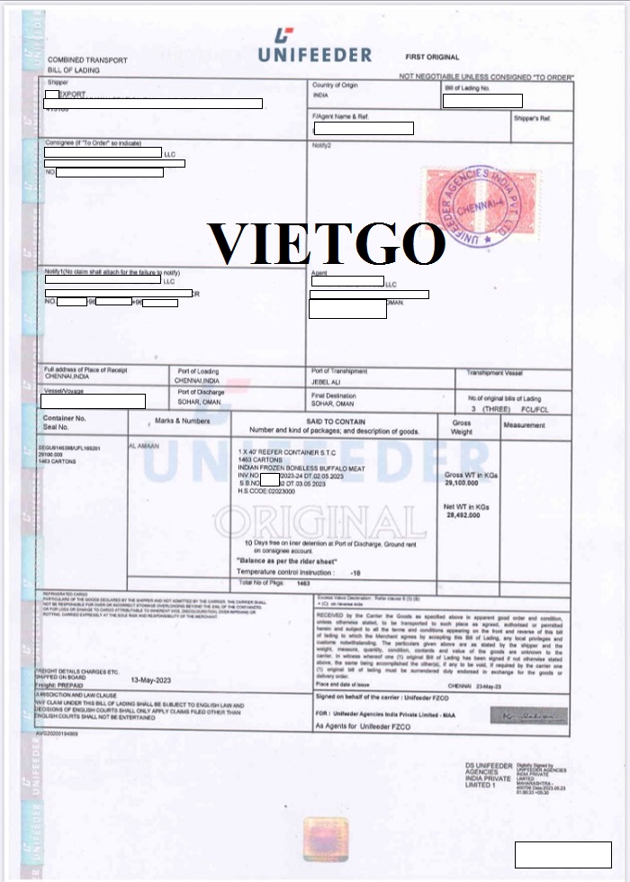 Hình ảnh vận đơn nhập khẩu thịt trâu rút xương từ Ấn Độ của công ty vị khách hàng ngày 13/05/2023