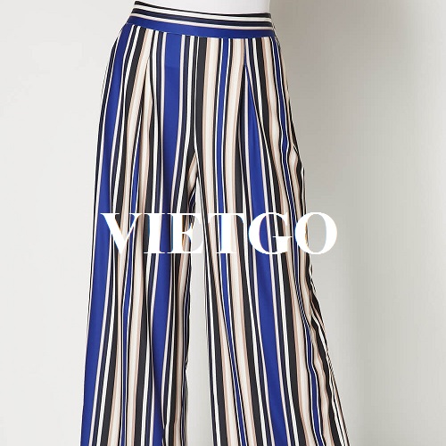 Thiết kế: Quần dài được cắt với phần ống suông, cực rộng, xòe ra từ thắt lưng, họa tiết sọc dài