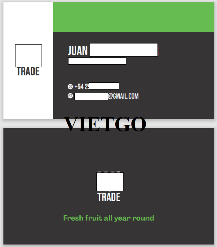 Không chỉ là cầu nối giữa người mua và người bán, công ty vị khách hàng còn trực tiếp kinh doanh, bán buôn các sản phẩm nông sản. ██████████ Trade LLC chuyên cung cấp và phân phối các sản phẩm trái cây tươi theo mùa. Một số loại sản phẩm được công ty vị khách hàng đẩy mạnh quảng bá có có thể kể đến như táo, cam, chuối, xoài, đu đủ,… Qua tìm hiểu, VIETGO có thể thấy rằng các sản phẩm do công ty ông Juan cung cấp không những đa dạng về thể loại, mẫu mã mà còn luôn được đảm bảo về chất lượng và nguồn gốc. Công ty luôn tích cực tìm kiếm các loại trái cây mới và thú vị để bổ sung vào dòng sản phẩm của mình, cũng như nâng cấp chất lượng các mặt hàng mà công ty đang kinh doanh.