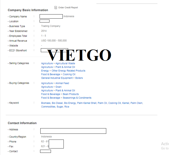 VIETGO vừa có cuộc trò chuyện với ông Yolanda về đơn hàng viên nén mùn cưa. Được biết, ông Yolanda là đại diện đến từ công ty PT. ██████████, có địa chỉ tại ██████████ No. ██████████, ██████████, Indonesia. PT. ██████████ là một công ty thương mại tổng hợp, chuyên phục vụ và cung cấp các mặt hàng khác nhau và mang đến giải pháp khi khách hàng có nhu cầu tìm kiếm nguồn cung ứng. Công ty tập trung vào các mặt hàng sinh khối, hàng hóa diesel sinh học, năng lượng sinh học, các sản phẩm nông nghiệp như ngũ cốc, dầu thực vật và động vật. vỏ hạt cọ, dầu cọ, đường, gạo…