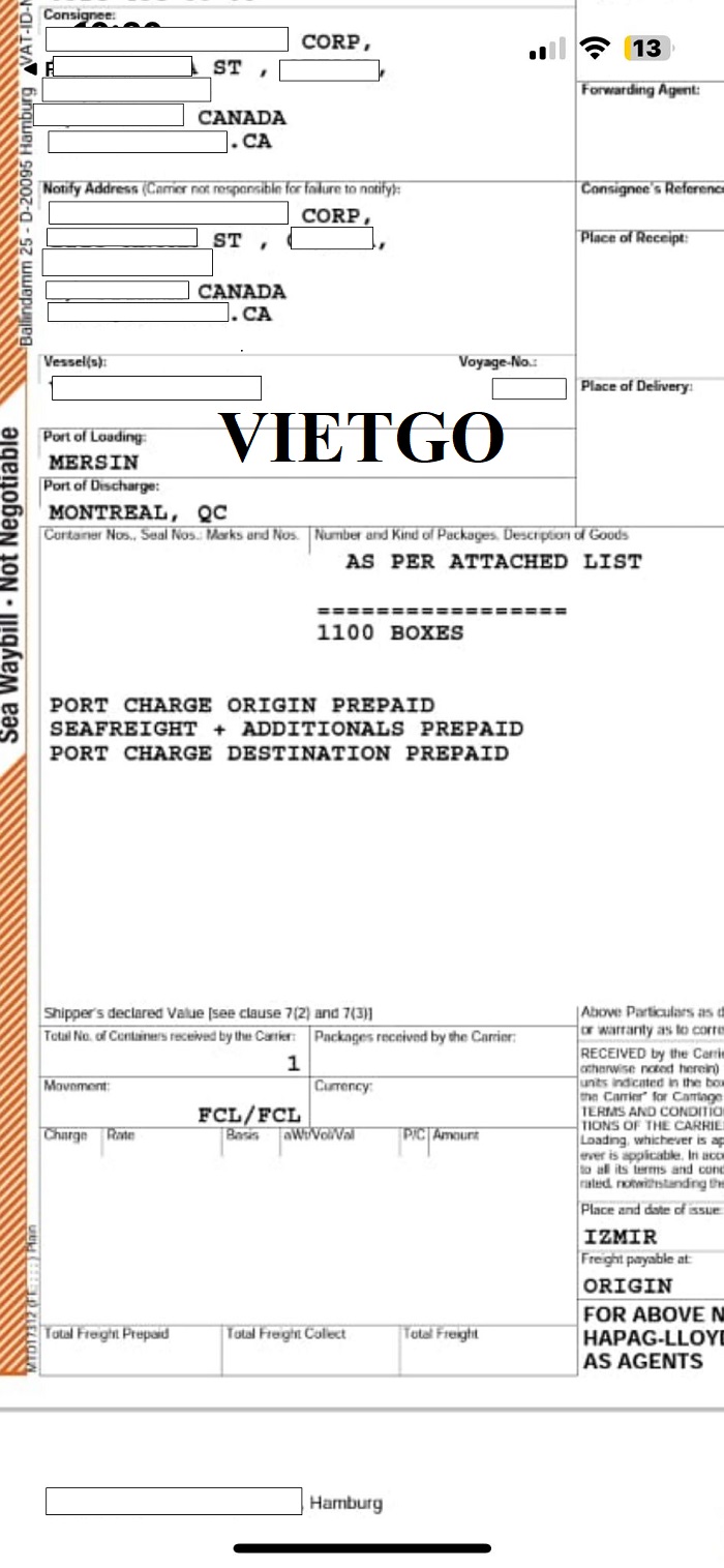 ██████████ đã nhập khẩu thành công nhiều sản phẩm từ nước ngoài. Dưới đây là hình ảnh vận đơn nhập khẩu sản phẩm thùng giấy vị khách hàng thực hiện nhập từ cảng Mersrsin, Thổ Nhĩ Kỳ sang cảng Montreal, Canada.