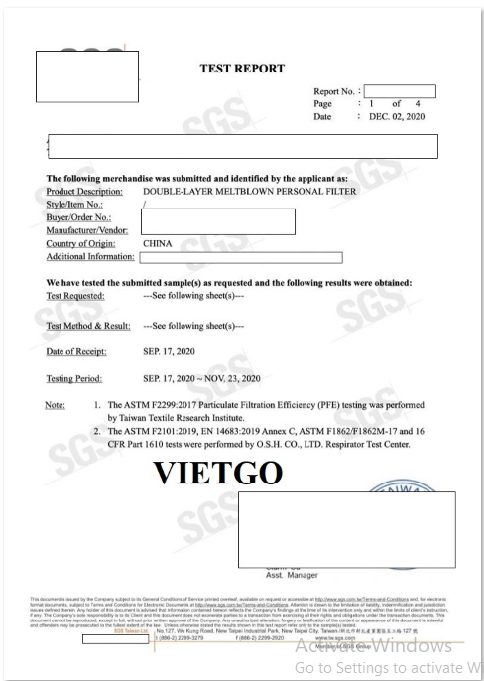 Giấy chứng nhận kiểm nghiệm của SGS cho sản phẩm khẩu trang y tế của ██████████ Inc