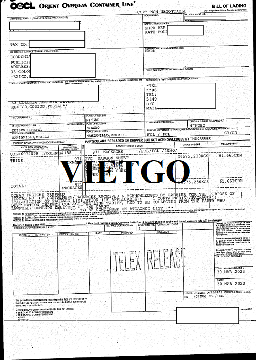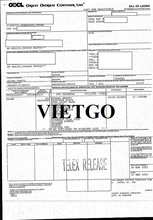 Hình ảnh vận đơn nhập khẩu vật tư in ấn từ Trung Quốc sang Mexico do công ty vị khách hàng thực hiện vào 30/03/2023