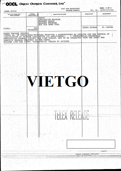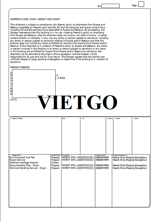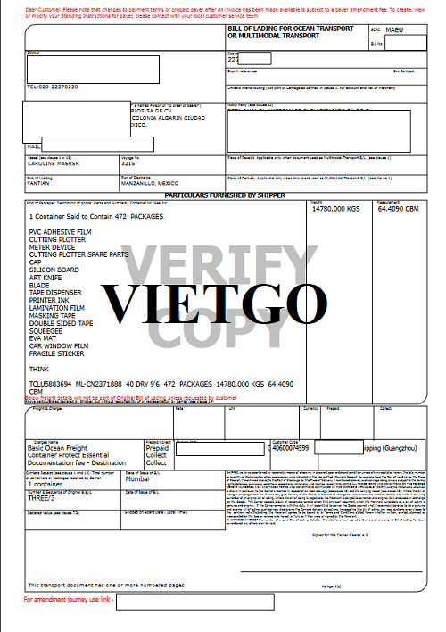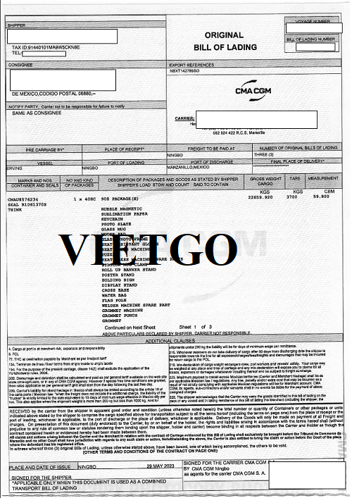 Hình ảnh vận đơn nhập khẩu vật tư in ấn từ Trung Quốc sang Mexico do công ty vị khách hàng thực hiện