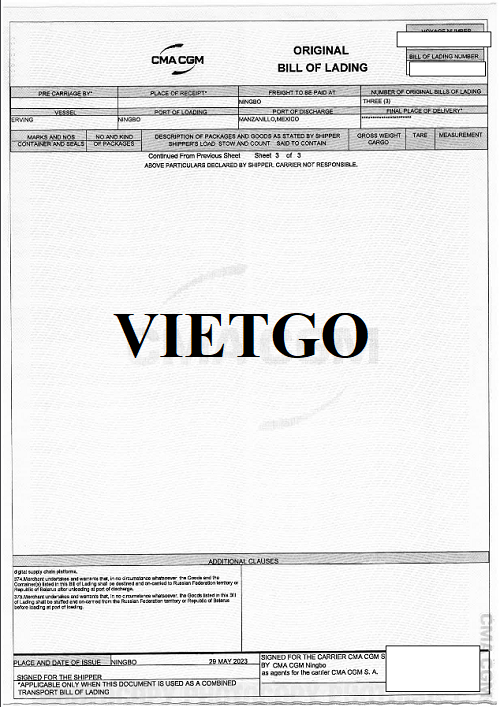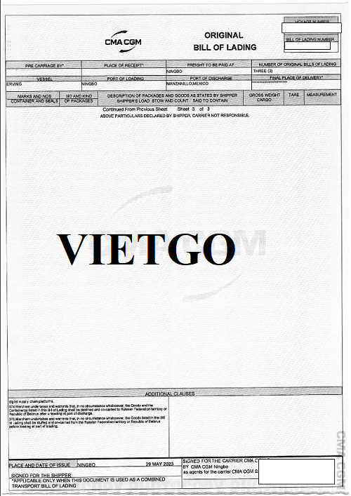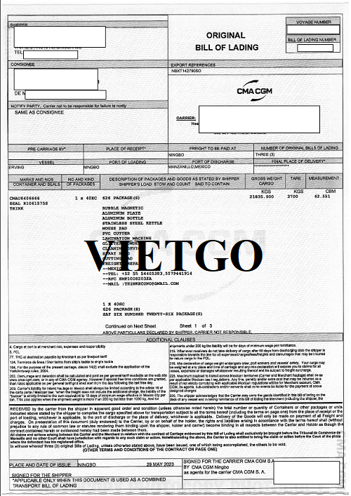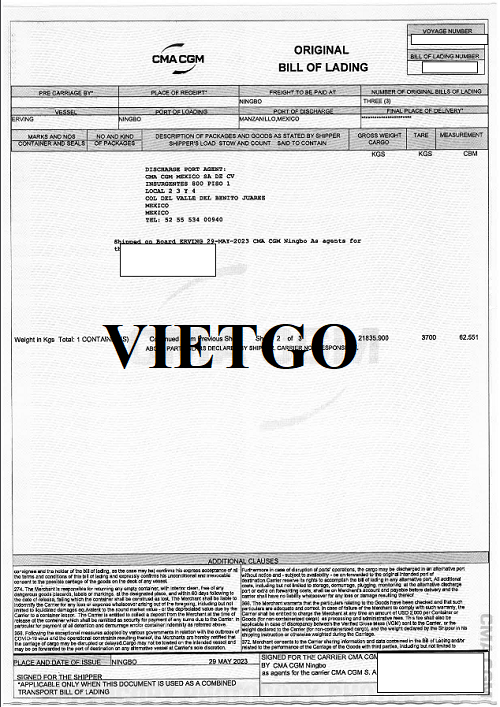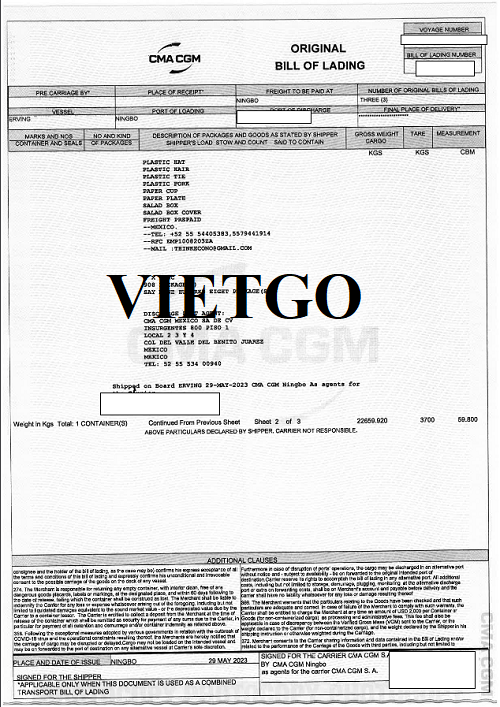 Hình ảnh vận đơn nhập khẩu vật tư in ấn từ Trung Quốc sang Mexico do công ty vị khách hàng thực hiện vào 29/05/2023
