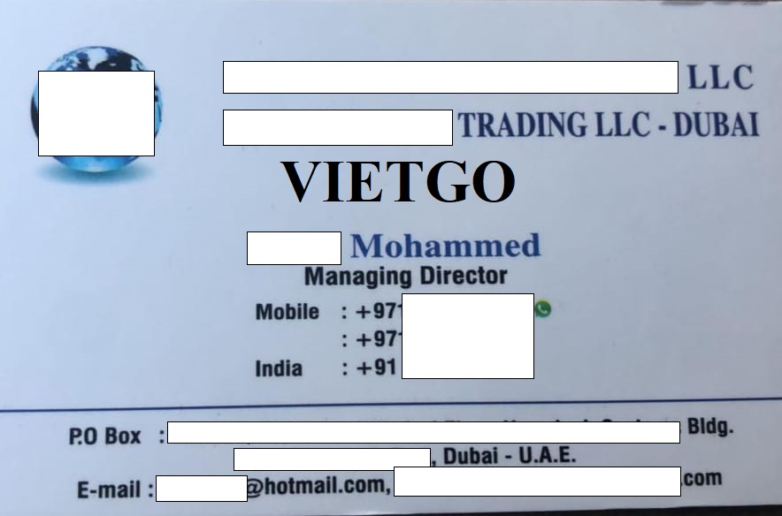 Qua trò chuyện, VIETGO đánh giá cao thiện chí hợp tác của ông Mohammed với nhà cung cấp tại khu vực châu Á. Quý nhà cung cấp nào có thể đáp ứng được nhu cầu của vị khách hàng tiềm năng này vui lòng liên hệ và gửi báo giá cho ông trong thời gian sớm nhất như thông tin liên hệ sau đây: