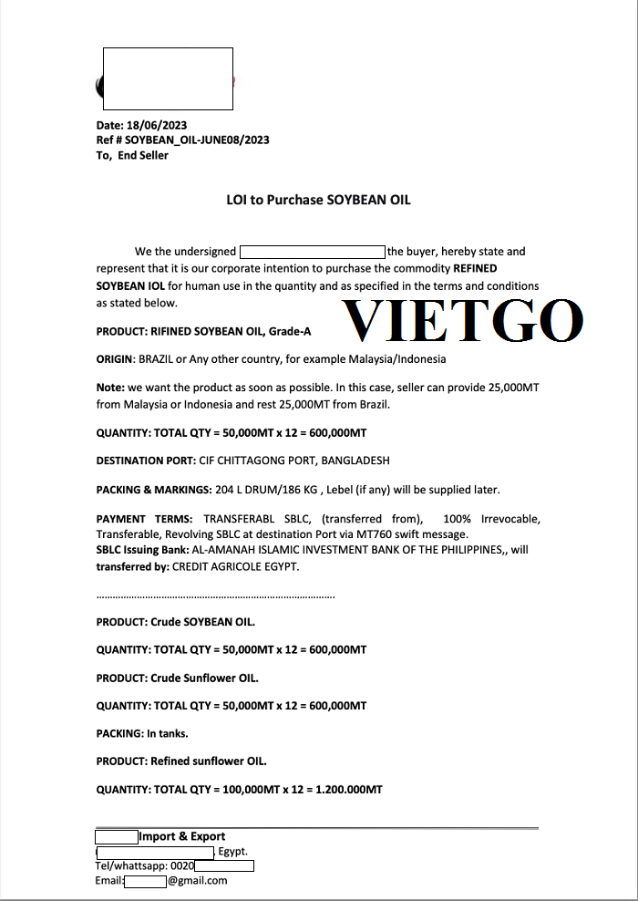 Ông Mohamad - đại diện cho công ty ██████████ Import & Export – hiện đang tìm kiếm nhà cung cấp sản phẩm dầu thực vật để nhập khẩu vào thị trường Ai Cập và Bangladesh. Vị khách hàng đang rất nóng lòng nhận được báo giá từ nhà cung cấp để có thể thực hiện đơn hàng trong thời gian sớm nhất.