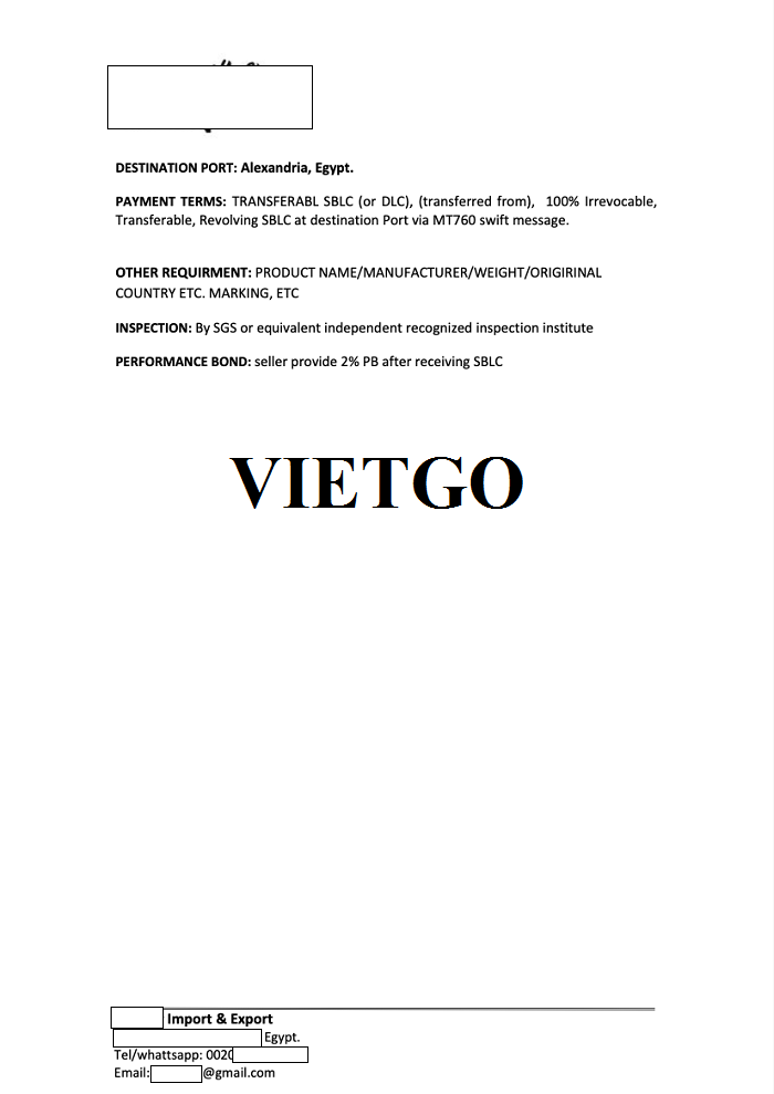 Hiện ông đang có nhu cầu tìm kiếm nhà cung cấp uy tín để có thể tiến hành đơn hàng nhập khẩu thường xuyên sang thị trường Ai Cập và Bangladesh. Ông có thiện chí muốn hợp tác lâu dài với công ty trong những đơn hàng nhập khẩu tiếp theo. Dưới đây là thông tin chi tiết về đơn hàng: