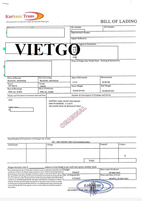 Hình ảnh vận đơn nhập khẩu hạt cau từ Indonesia vào tháng 05/2023