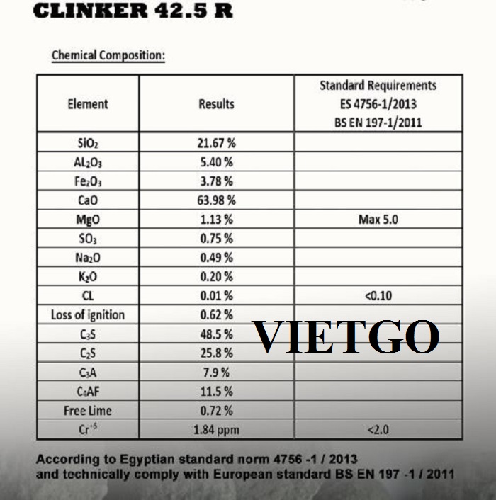 Yêu cầu: Clinker loại 1, có chất lượng tốt, dùng để sản xuất xi măng 42.5R