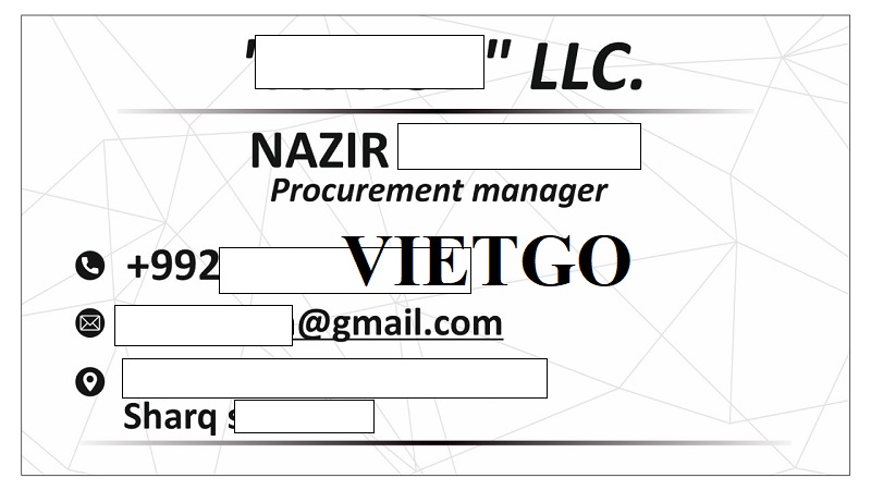 Ông Nazir hiện đang đảm nhận vị trí Quản lý thu mua tại công ty ““██████████” LLC có văn phòng chính được đặt tại thành phố Khujand, Tajikistan. Liên hệ trực tiếp cùng VIETGO, ông Nazir có đề xuất một đơn hàng nhập khẩu sản phẩm hạt điều rang muối nguyên vỏ về thị trường nội địa để tiêu thụ. Đơn hàng lần này được thực hiện nhằm mục đích phục vụ hoạt động kinh doanh của công ty ông.