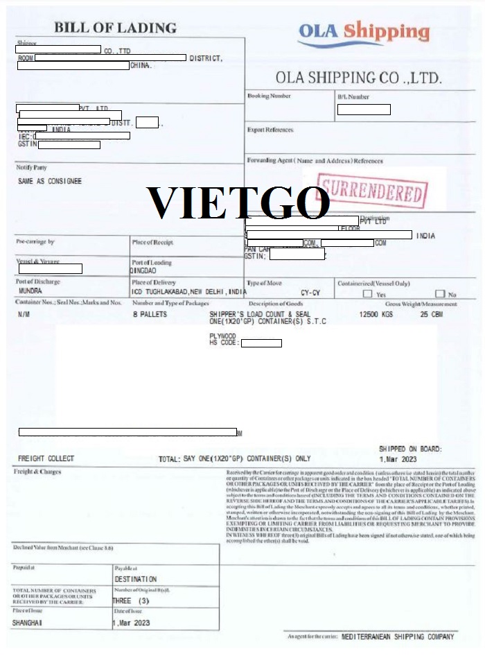 Hình ảnh bản vận đơn của chuyến hàng ông Manish nhập khẩu thành công 1 container 20GP gỗ dán từ cảng Thanh Đảo, Trung Quốc đến cảng ICD, Ấn Độ vào ngày 01/03/2023 vừa qua