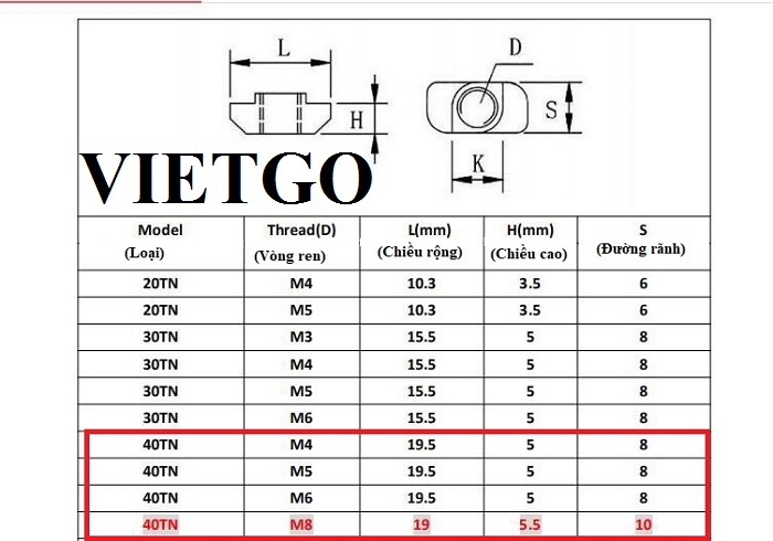 Loại: Đai ốc chữ T series 4040 vòng ren (thread) M4, M5, M6, M8; rãnh trượt (slot) 10mm