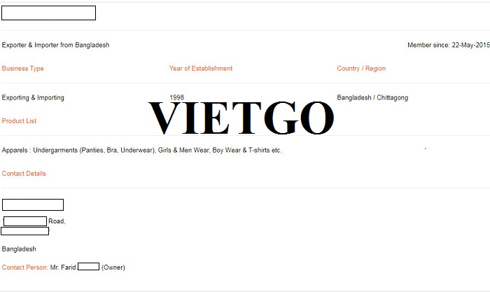 Vừa qua, ông Farid đã có cuộc thảo luận với VIETGO và bày tỏ mong muốn được nhập khẩu gỗ lim tới thị trường Bangladesh. Ông là quản lý trực tiếp của công ty ██████████ Bangladesh thuộc tập đoàn ██████████. Công ty của ông Farid được biết đến là một trong những doanh nghiệp về xuất khẩu các loại hàng hóa tại Bangladesh.