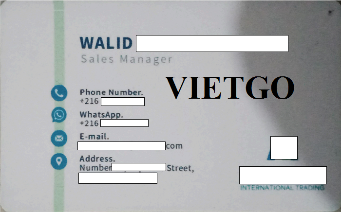 Ông Walid – vị khách hàng của VIETGO lần này là đại diện mua hàng đến từ công ty ██████████ International Trading. ██████████ International Trading là một công ty chuyên xuất khẩu các mặt hàng nông sản và thực phẩm. Công ty của vị khách hàng đã phát triển, nhờ vào sự cam kết của một đội ngũ nghiêm túc và chuyên nghiệp, và chuyên môn ở cấp độ quốc tế. Đây là một công ty thương mại quốc tế tại Tunisia chuyên xuất khẩu các sản phẩm nông sản có nguồn gốc từ Tunisia từ các vùng khác nhau. Với các sản phẩm nông nghiệp, thực phẩm đa dạng, ██████████ International Trading xuất khẩu và phân phối chính các mặt hàng như dầu ôliu, rau, củ, quả; chà là, mì ống, nước ngọt, chất bảo quản, gia vị, các sản phẩm từ sữa và nhiều sản phẩm khác.