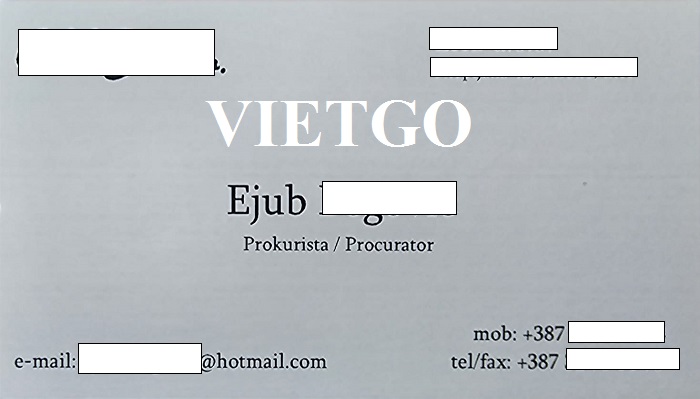 Ông Ejub ██████████ bày tỏ sự tiên tưởng và rất hy vọng với sự giúp đỡ của VIETGO, ông sẽ sớm có thể kết nối thành công với nhà cung cấp phù hợp với thiện chí hợp tác lâu dài và tin cậy. Với những chia sẻ trên, ông rất mong muốn nhận được phản hồi về mức giá cạnh tranh từ phía nhà cung cấp của VIETGO. Vậy, Quý nhà cung cấp nào quan tâm đến đơn hàng nhập khẩu của vị khách hàng, vui lòng liên hệ với ông theo địa chỉ thông tin liên lạ dưới đây: