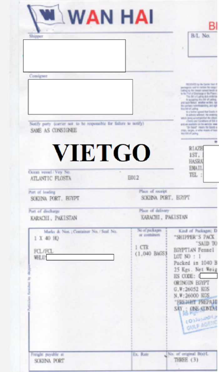 Hình ảnh bản vận đơn nhập khẩu hạt tiêu đen từ Ai Cập của công ty vị khách hàng
