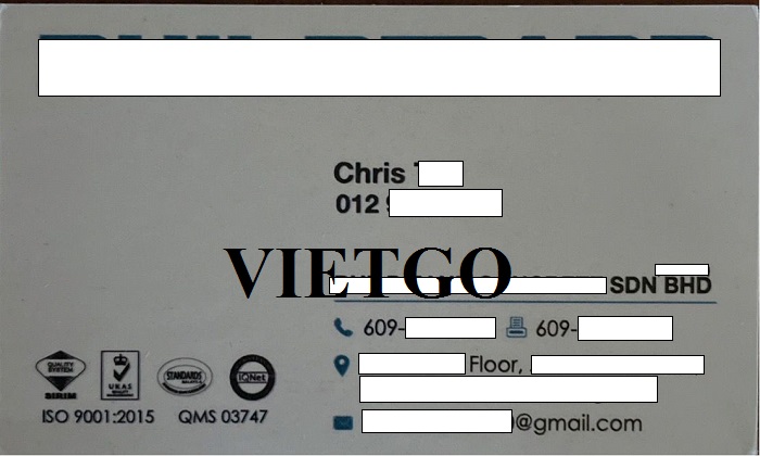 Vừa qua, VIETGO đã nhận được một lời đề nghị báo giá từ ông Chris - đại diện của công ty ██████████ Sdn Bhd - về đơn hàng nhập khẩu xỉ hạt lò cao tới thị trường Malaysia.