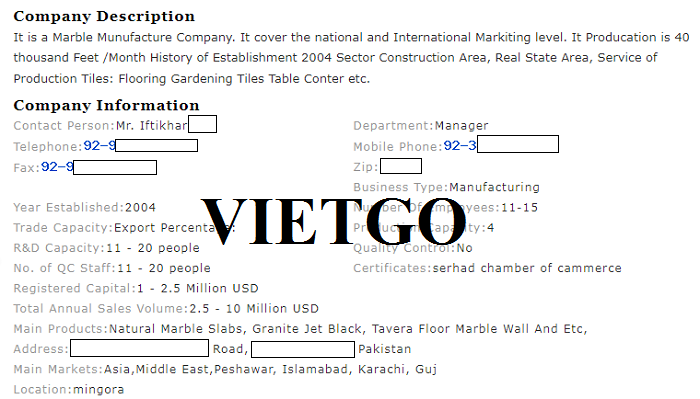 Ông Iftikhar cho biết: “Chúng tôi, ██████████, là một công ty sản xuất đá marble được thành lập năm 2004 tại Mingora, Pakistan. Chúng tôi chuyên sản xuất đá lát nền, đá lát sân vườn, mặt bàn, v.v. bằng chất liệu đá marble. Ngoài ra, chúng tôi cũng cung cấp đá marble tấm tự nhiên, đá granite đen, gạch marble ốp tường. Thông qua VIETGO, tôi hy vọng sẽ tìm được nhà cung cấp đá marble trắng với số lượng 12,000 ft2 (tương đương 1,115 m2) cho lần nhập thử. Nếu sản phẩm có chất lượng tốt và mức giá hợp lí, tôi có thể nhập khẩu hàng tháng với số lượng tối thiểu như trên. Hy vọng sẽ sớm nhận được báo giá từ các bạn để chúng ta có thể nhanh chóng tiến đến hợp tác”.