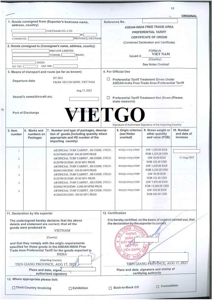 Hình ảnh vận đơn nhập khẩu thảm cỏ nhân tạo từ Việt Nam do công ty vị khách hàng thực hiện vào ngày 17 tháng 08 năm 2023