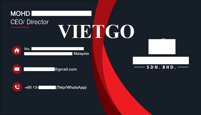 VIETGO tin rằng đây sẽ là một khởi đầu tốt cho mối quan hệ hợp tác hữu nghị giữa công ty ông Mohd ██████████████████████████████ và các nhà cung cấp. Vì vậy, Quý nhà cung cấp quan tâm đến đơn hàng nhập khẩu của vị khách hàng vui lòng liên hệ và báo giá với ông theo địa chỉ thông tin liên hệ dưới đây:
