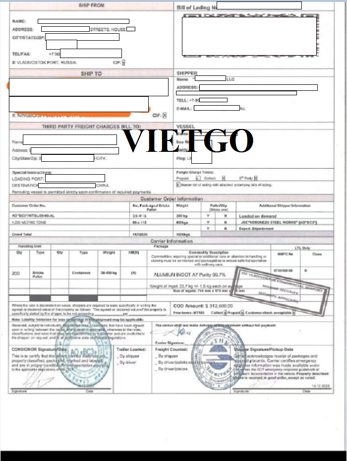 Dưới đây là hình ảnh vận đơn nhập khẩu thành công sản phẩm nhôm từ Nga của công ty ông vào ngày 14/12/2022.