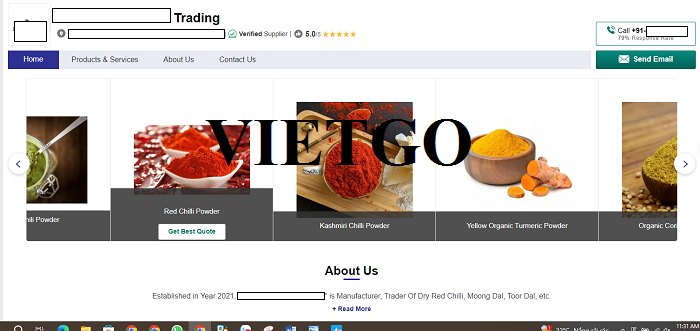Ông Jun, vị khách hàng của VIETGO lần này đồng thời là đại diện mua hàng của công ty ██████████ Trading, công ty có trụ sở văn phòng chính đặt tại Ấn Độ. ██████████ Trading là công ty hàng đầu của Ấn Độ về kinh doanh, tiếp thị và phân phối các nguyên liệu và phụ gia thực phẩm. Công ty cung cấp, xuất khẩu và kinh doanh dầu tinh chế, dầu ăn, ngũ cốc, đậu, lúa mì, bột mì, nhiên liệu năng lượng sinh học, đường, thực phẩm, vật liệu xây dựng, nhựa, kim loại và nhiều mặt hàng khác để đáp ứng nhu cầu đa dạng của khách hàng. Với hơn 200 sản phẩm và hệ thống nhà cung cấp chất lượng, ██████████ Trading đã cung cấp các giải pháp toàn diện cho hơn 1.000 khách hàng.