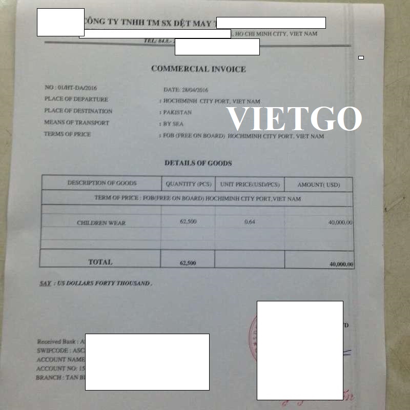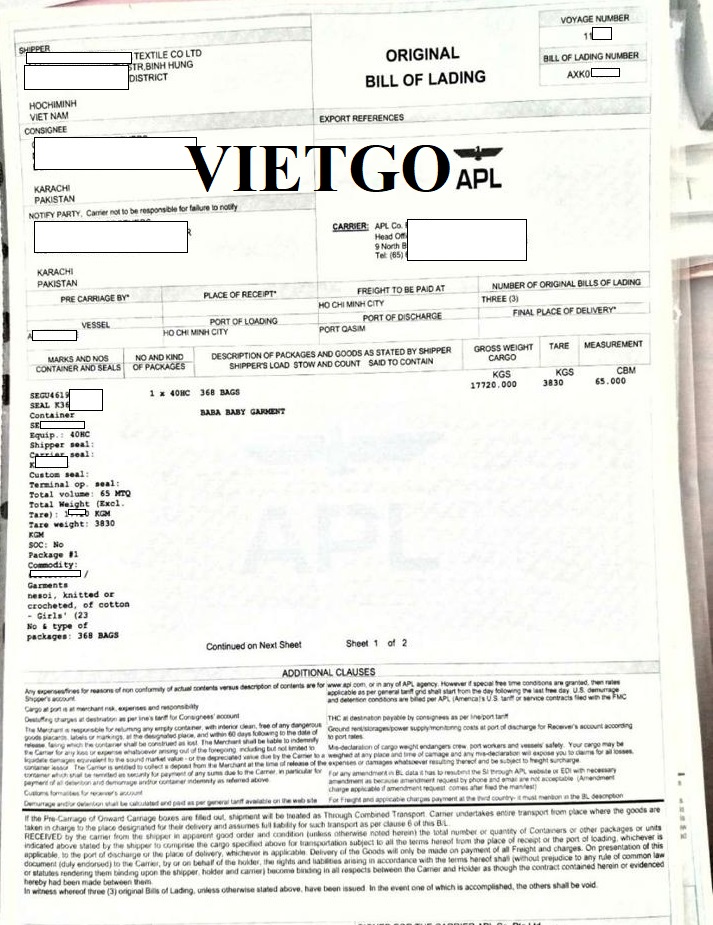 Dưới đây là bản vận đơn nhập khẩu quần áo trẻ em từ Việt Nam sang Pakistan mà vị khách hàng đã thực hiện thành công trong thời gian qua.