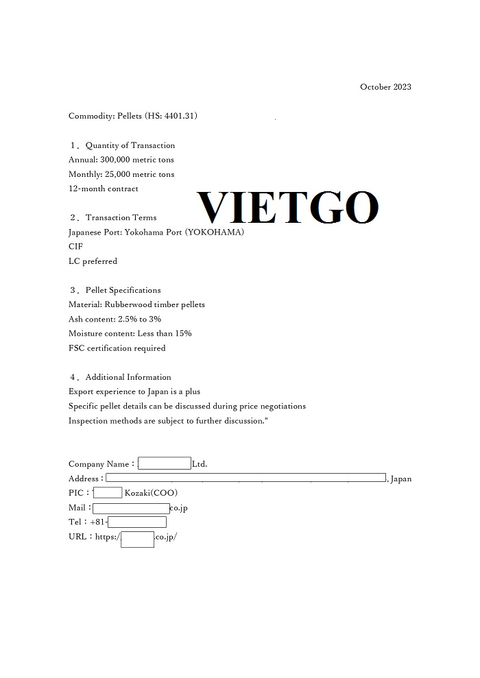 VIETGO xin gửi tới Quý vị thông tin đơn hàng nhập khẩu viên nén mùn cưa của ông Kozaki – vị khách hàng đến từ Nhật Bản.