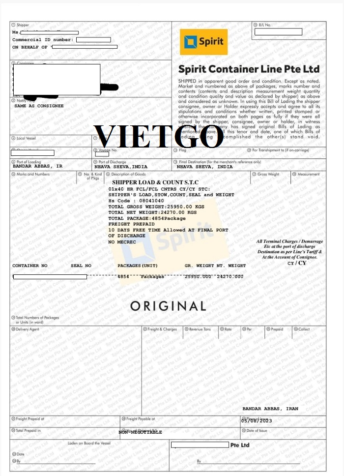 Dưới đây là hình ảnh vận đơn xuất khẩu thành công sản phẩm tới Ấn Độ của công ty ông vào ngày 05/08/2023.