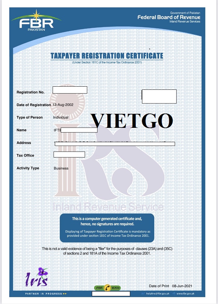 Hình ảnh đăng ký thuế của công ty khách hàng
