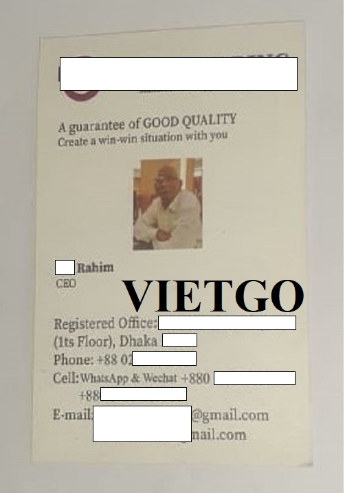 Chia sẻ với VIETGO, vị khách hàng cho biết: “Bắt đầu sự nghiệp kinh doanh của mình từ năm 1983, tôi đã thành lập ██████████ Trading tại thủ đô Dhaka, Bangladesh hướng tới tầm nhìn trở thành công ty tiên phong trong lĩnh vực kinh doanh quốc tế. “Với hình thức kinh doanh chính là đầu tư, chúng tôi tham gia vào đầu tư kinh doanh với mục đích nâng cao khả năng của mình để phù hợp với nhu cầu của khách hàng và mở rộng quy mô hoạt động bằng cách sử dụng những kiến thức chuyên môn được trau dồi trong kinh doanh thương mại. Thay vì đầu tư với mục tiêu ngắn hạn, chúng tôi quyết định đầu tư với các chiến lược dài hạn nhằm mục tiêu phát triển và mở rộng doanh nghiệp cùng với các đối tác trong và ngoài nước.