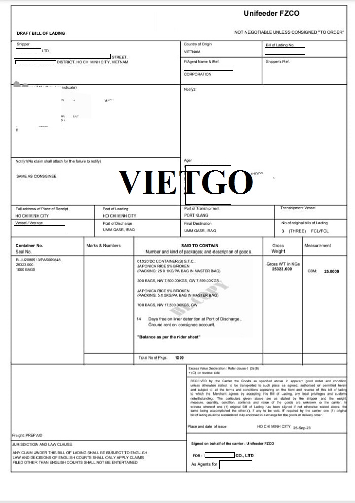 Dưới đây là bản vận đơn nhập khẩu của công ty vị khách hàng sản phẩm gạo từ Việt Nam vào tháng 9/2023.