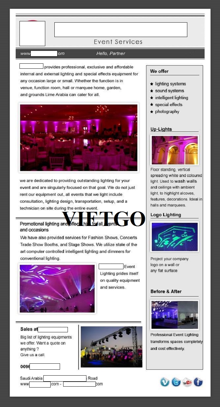 Ông Nasser – vị khách hàng của VIETGO lần này đang quan tâm tới sản phẩm trái cây sấy khô và cần nhập khẩu mặt hàng này về thị trường Lebanon để phục vụ cho các dự án kinh doanh của ông tại đây. Qua quá trình tìm hiểu, VIETGO biết được rằng ông Nasser từng làm việc cho công ty ██████████ có trụ sở chính được đặt tại Ả-rập Xê-út. Được thành lập và đi vào hoạt động từ năm 2009, ██████████ được biết đến là công ty chuyên cung cấp các dịch vụ liên quan đến tiếp thị và tổ chức sự kiện như thiết kế ánh sáng, thi công sân khấu, kỹ thuật âm thanh,...