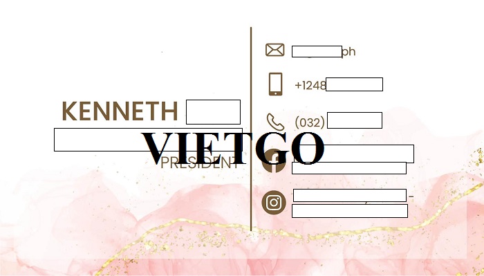 Rất mong Quý nhà cung cấp quan tâm tới đơn hàng có thể sớm liên lạc và báo giá với ông trong thời gian sớm nhất. Quý nhà cung cấp vui lòng liên hệ với ông Kenneth qua các thông tin dưới đây để nhanh chóng báo giá và xuất khẩu thành công đơn hàng hấp dẫn này.