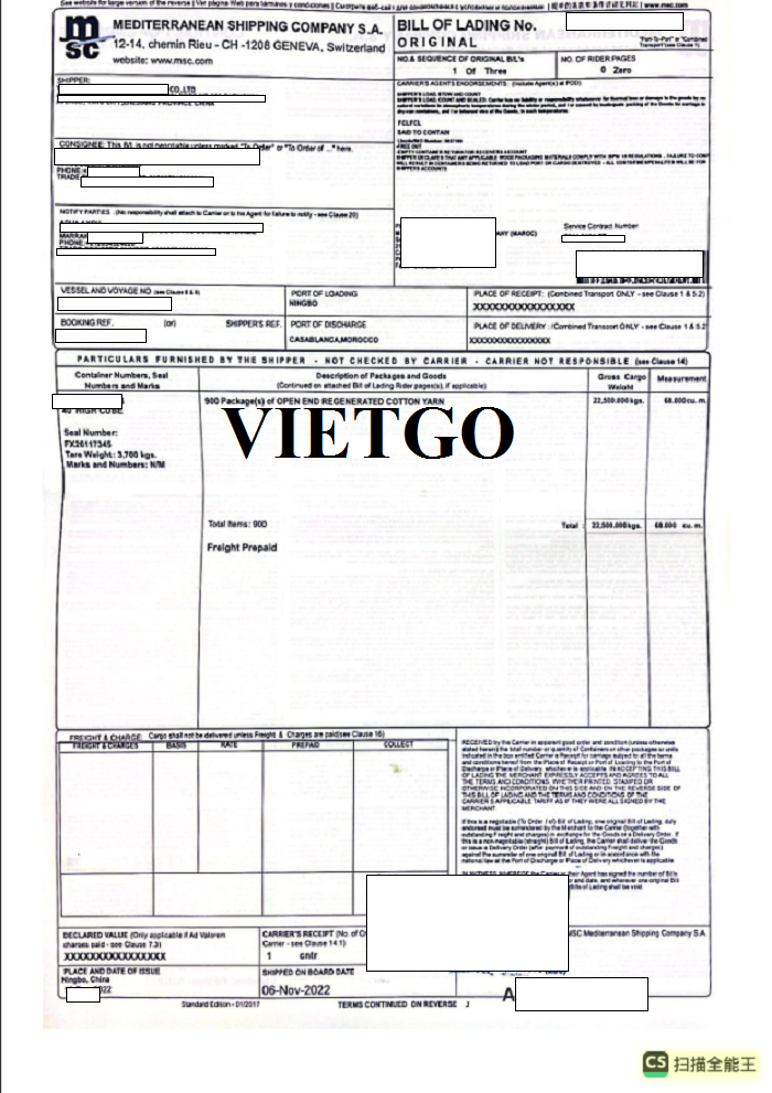 Hình ảnh vận đơn nhập khẩu sợi từ Trung Quốc sang Morocco do công ty vị khách hàng thực hiện vào 06/10/2022