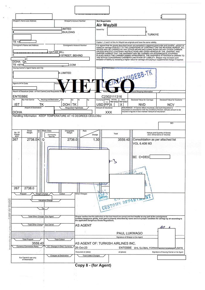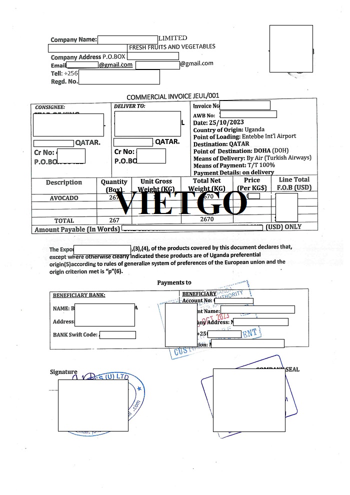 Dưới đây là hình ảnh bộ chứng từ bao gồm Vận đơn đường hàng không, Hóa đơn thương mại, Bảng kê danh sách hàng hoá đóng thùng chi tiết, Giấy chứng nhận xuất xứ và Giấy chứng nhận kiểm dịch từ Cộng hòa Uganda cho đơn hàng nhập khẩu bơ từ Cộng hòa Uganda ngày 25/10/2023 mà công ty vị khách hàng đã thực hiện thành công: