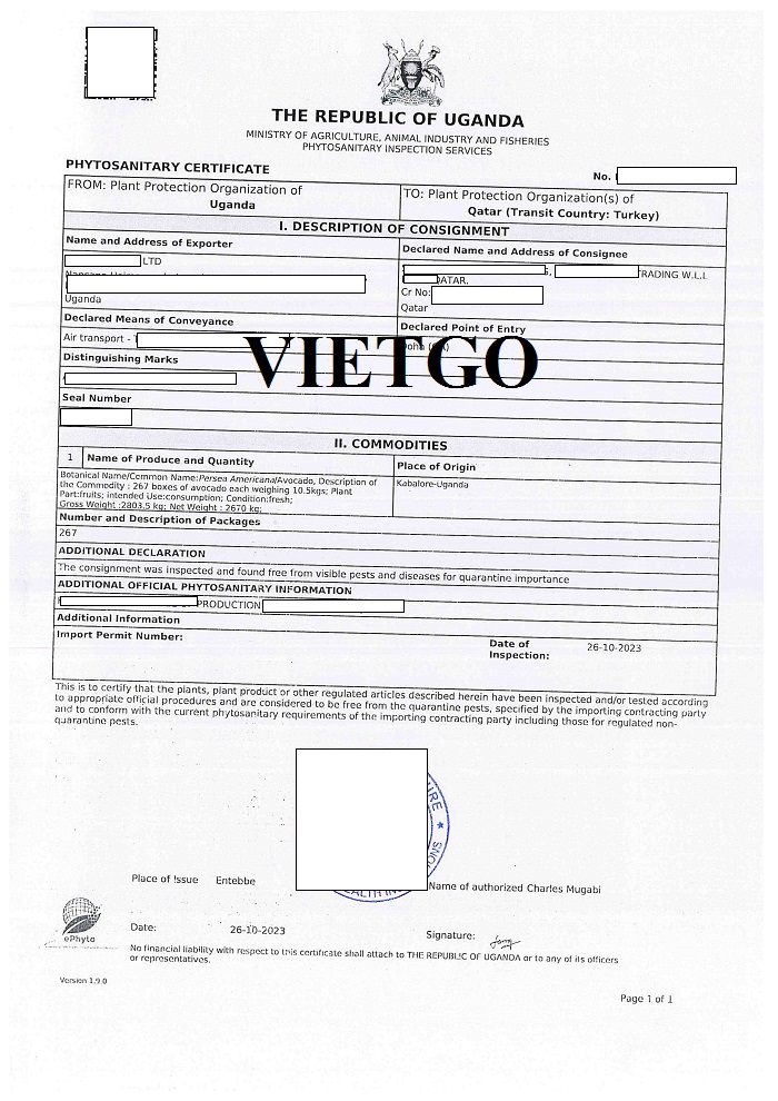 Hình ảnh giấy chứng nhận kiểm dịch từ Cộng hòa Uganda