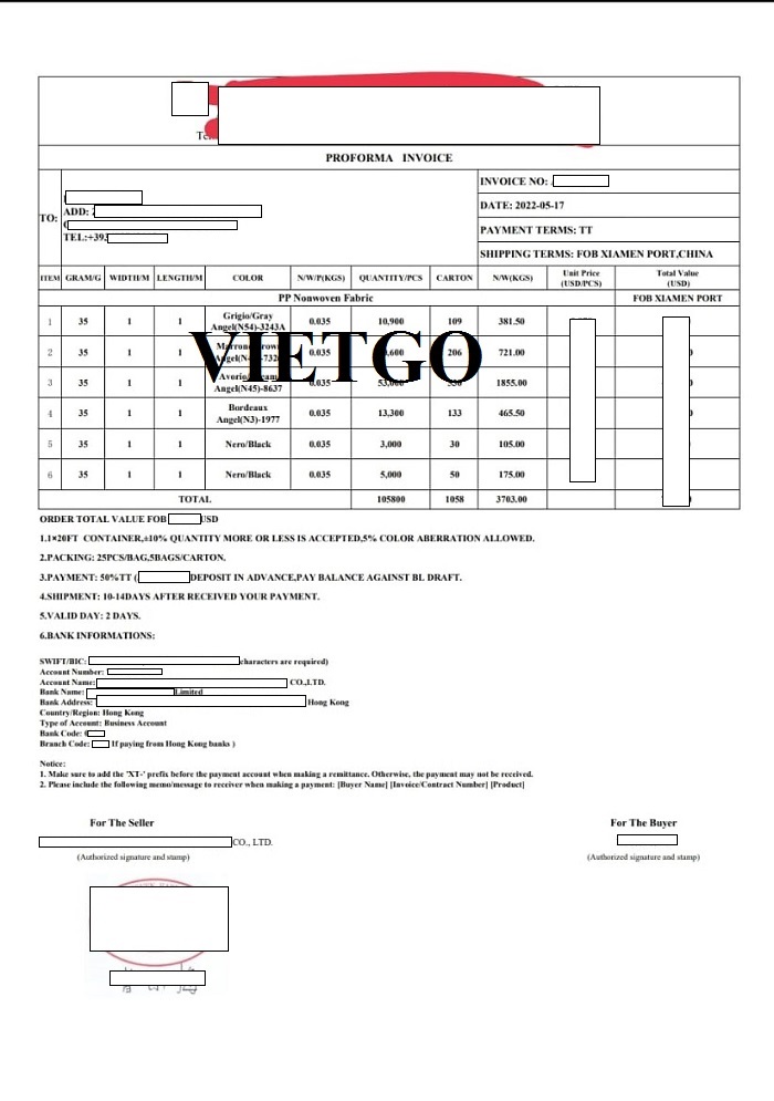 Hình ảnh hóa đơn chiếu lệ của một giao dịch nhập khẩu từ Trung Quốc do vị khách hàng phụ trách