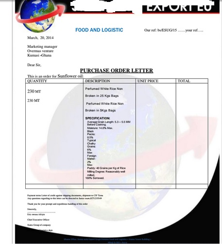 Các mặt hàng nông sản của công ty chúng tôi được nhập khẩu chủ yếu từ Việt Nam, quốc gia có nguồn năng lượng dồi dào, phong phú. Trong đơn hàng lần này, chúng tôi lại tìm đến Việt Nam như một quốc gia tin cậy trong đơn hàng gạo này. Hiện nay sản phẩm gạo đang là mặt hàng được quan tâm nhất trên thị trường Ghana. Chính vì thế, chúng tôi luôn mong muốn tìm kiếm thêm nhà cung cấp về sản phẩm gạo này từ quốc gia Việt Nam. Hy vọng thông qua đơn hàng này, chúng tôi có cơ hội được hợp tác với các nhà cung cấp gạo từ Việt Nam.
