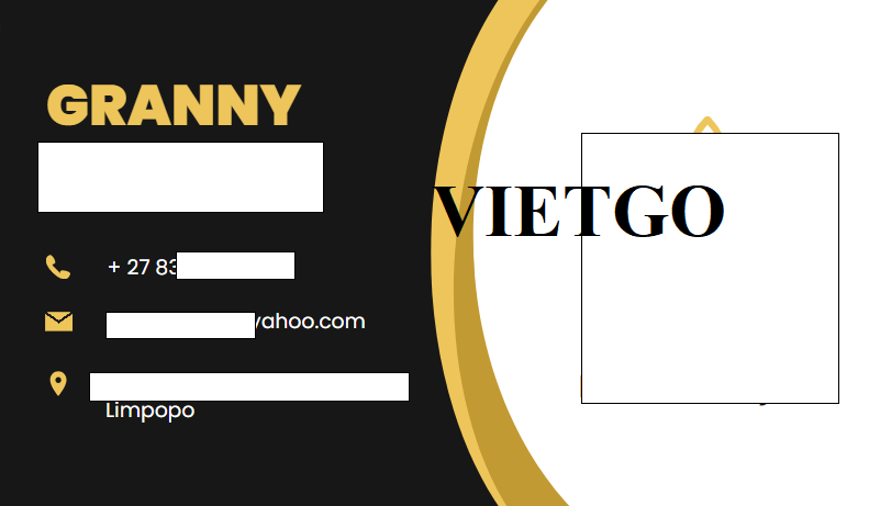 Vừa qua, ông Granny đã liên hệ với VIETGO và mong muốn được nhập khẩu cửa sổ tới thị trường Nam Phi. Ông Granny ██████████hiện đang là Quản lý của công ty ██████████. Ông là người chịu trách nhiệm chính trong việc nhập khẩu và kinh doanh các sản phẩm của công ty. Công ty của ông Granny được biết đến là một trong những doanh nghiệp tư nhân nhập khẩu các sản phẩm nội – ngoại thất ở Nam Phi.