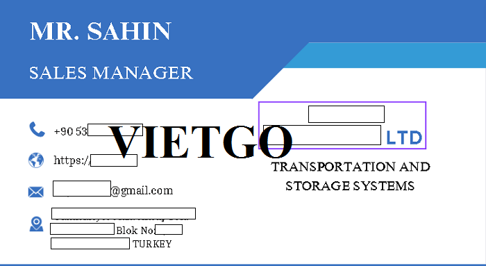 Ông Sahin là Quản lý kinh doanh của ██████████ Ltd, công ty có trụ sở đặt tại thành phố Bursa, Thổ Nhĩ Kỳ. ██████████ Ltd vốn là công ty chuyên kinh doanh và xuất nhập khẩu các sản phẩm vận chuyển và lưu trữ như khung gầm, container, băng tải, toa tàu chở hàng, v.v. Công ty chuyên sản xuất, thiết kế dự án cũng như cung cấp dịch vụ tư vấn cho khách hàng. Với bề dày lịch sử và truyền thống của mình, ██████████ Ltd đã tích lũy được nhiều kinh nghiệm trong kinh doanh và đã đạt được những bước tiến lớn đối với lĩnh vực xuất nhập khẩu. Song song với đó, công ty luôn ưu tiên xây dựng quan hệ đối tác chặt chẽ với các nhà cung cấp cũng như khách hàng ngoại để mở rộng phạm vi kinh doanh ra thị trường quốc tế.