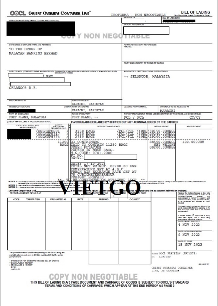 Dưới đây là bản vận đơn nhập khẩu sản phẩm khoai tây từ Pakistan về Malaysia vào ngày 15/11/2023 mà công ty ông đã thực hiện thành công: