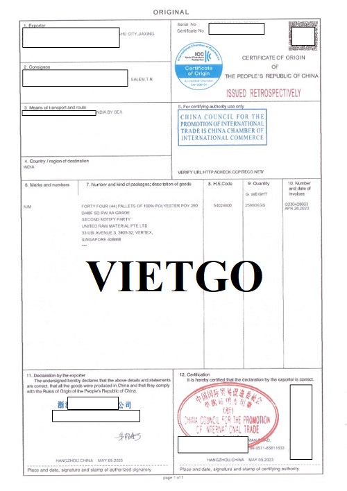 Hình ảnh chứng nhận xuất xứ của đơn hàng nhập khẩu sợi polyester từ Trung Quốc sang Ấn Độ do công ty vị khách hàng thực hiện vào 05/05/2023