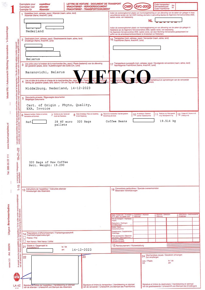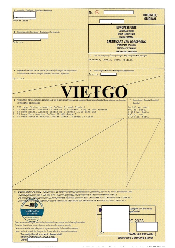 Dưới đây là hình ảnh vận đơn và giấy chứng nhận xuất xứ đơn hàng nhập khẩu cà phê từ Hà Lan vào tháng 12/2023 của công ty vị khách hàng: