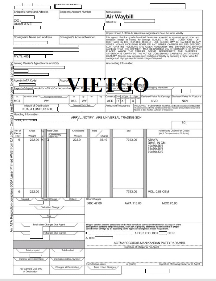 Vận đơn nhập khẩu sản phẩm quần áo may sẵn của vị khách hàng từ thị trường Dubai tới Malaysia