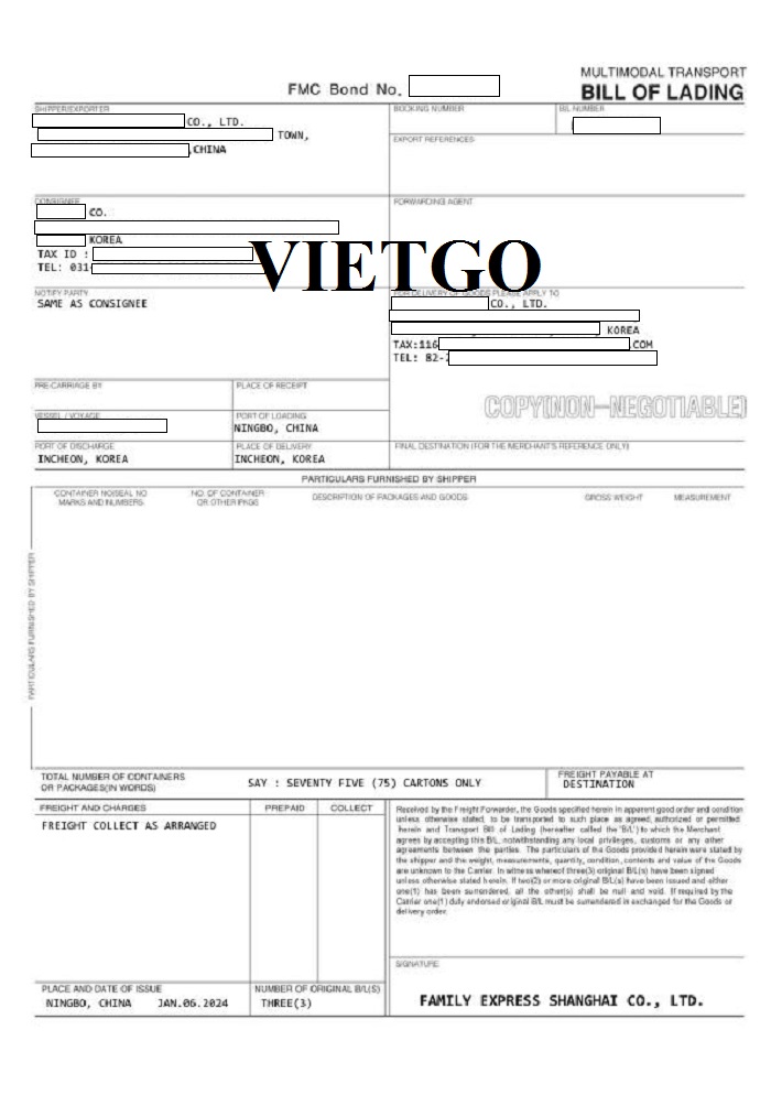 Dưới đây là hình ảnh bản vận đơn cho đơn hàng nhập khẩu sản phẩm dầu ăn đã qua sử dụng từ Trung Quốc đến Hàn Quốc ngày 6/1/2024 mà công ty vị khách hàng đã thực hiện thành công: